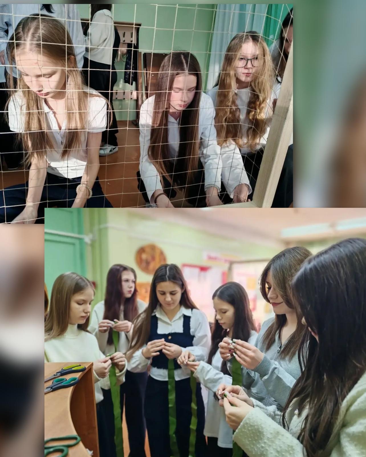 Ведущий специалист Дарья Александровна Хлыбова с жёнами бойцов СВО, а также представители серебряных волонтёров показали мастер-класс для учениц 8-х классов по плетению сетей для наших защитников.